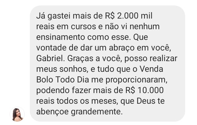 São 12 vezes de 10,03, para você ter acesso ao método exato que pode te levar dos boletos atrasados aos R$10 mil reais por mês, trabalhando com bolos artesanais – direto da sua cozinha, ao lado dos seus filhos, perto de quem você mais ama.