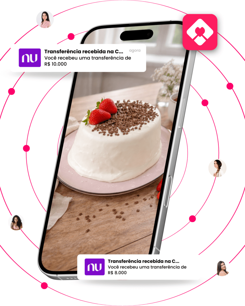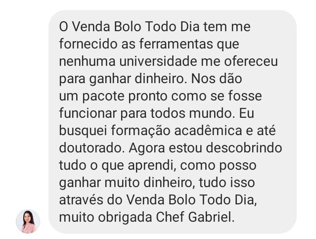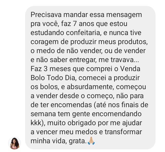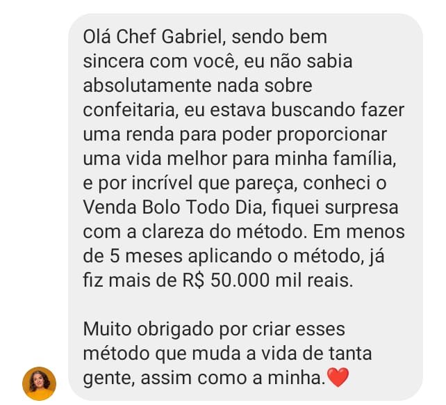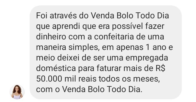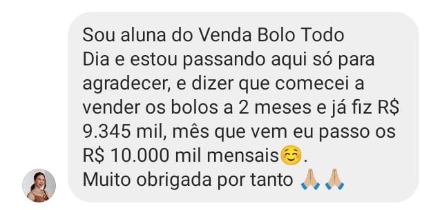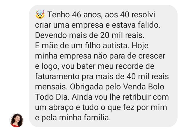 Hoje, depois de muitos anos de luta, estudo e prática, eu ajudo mais de 10 mil alunas a transformarem a cozinha de casa no lugar onde renascem financeiramente, e hoje podem viver exclusivamente da venda de bolos artesanais e conquistarem uma renda de até R$10 mil reais TODOS OS MESES com bolos artesanais, sem precisar sair de casa, sem deixar os filhos pra trás. Com dignidade, segurança… e orgulho do que constroem com as próprias mãos.